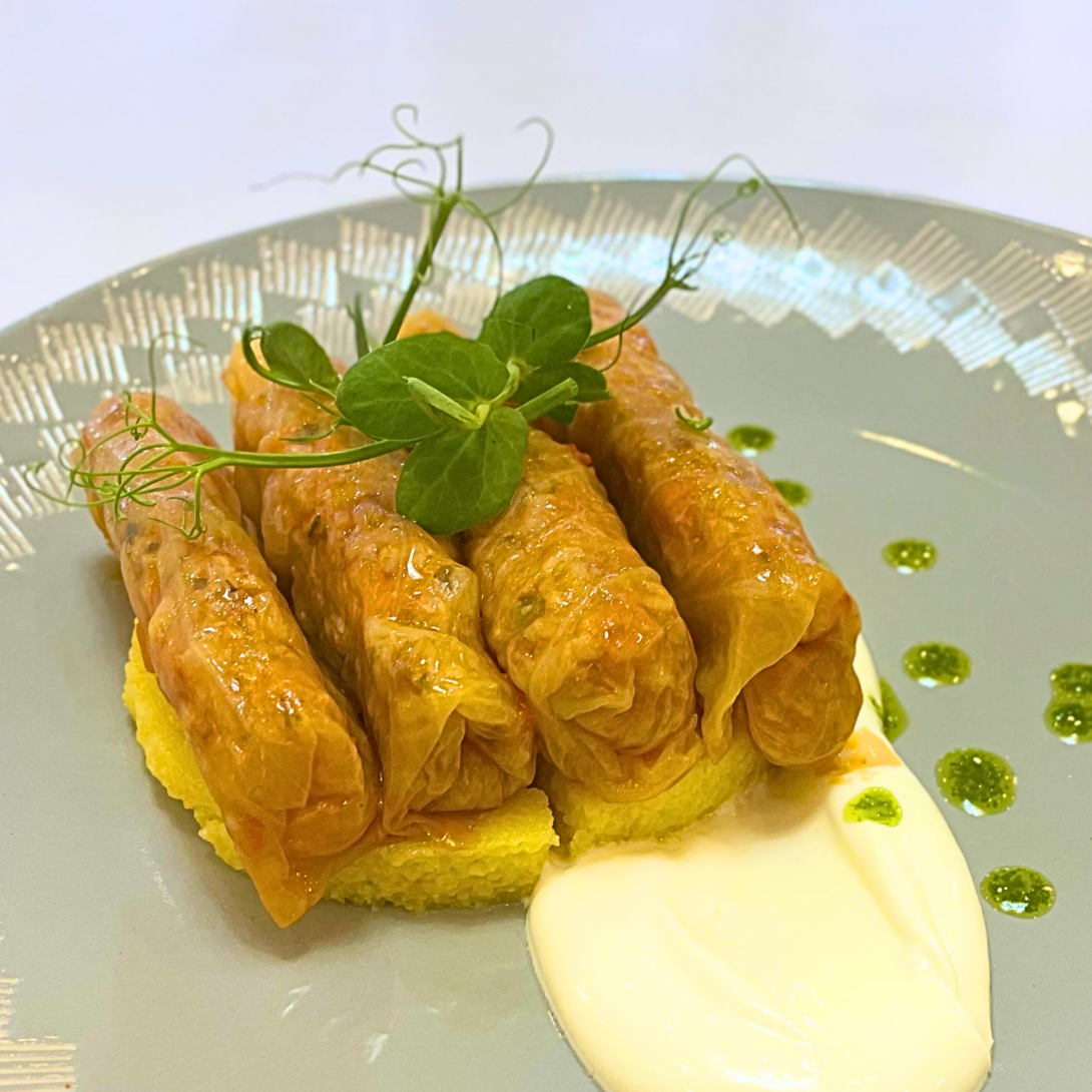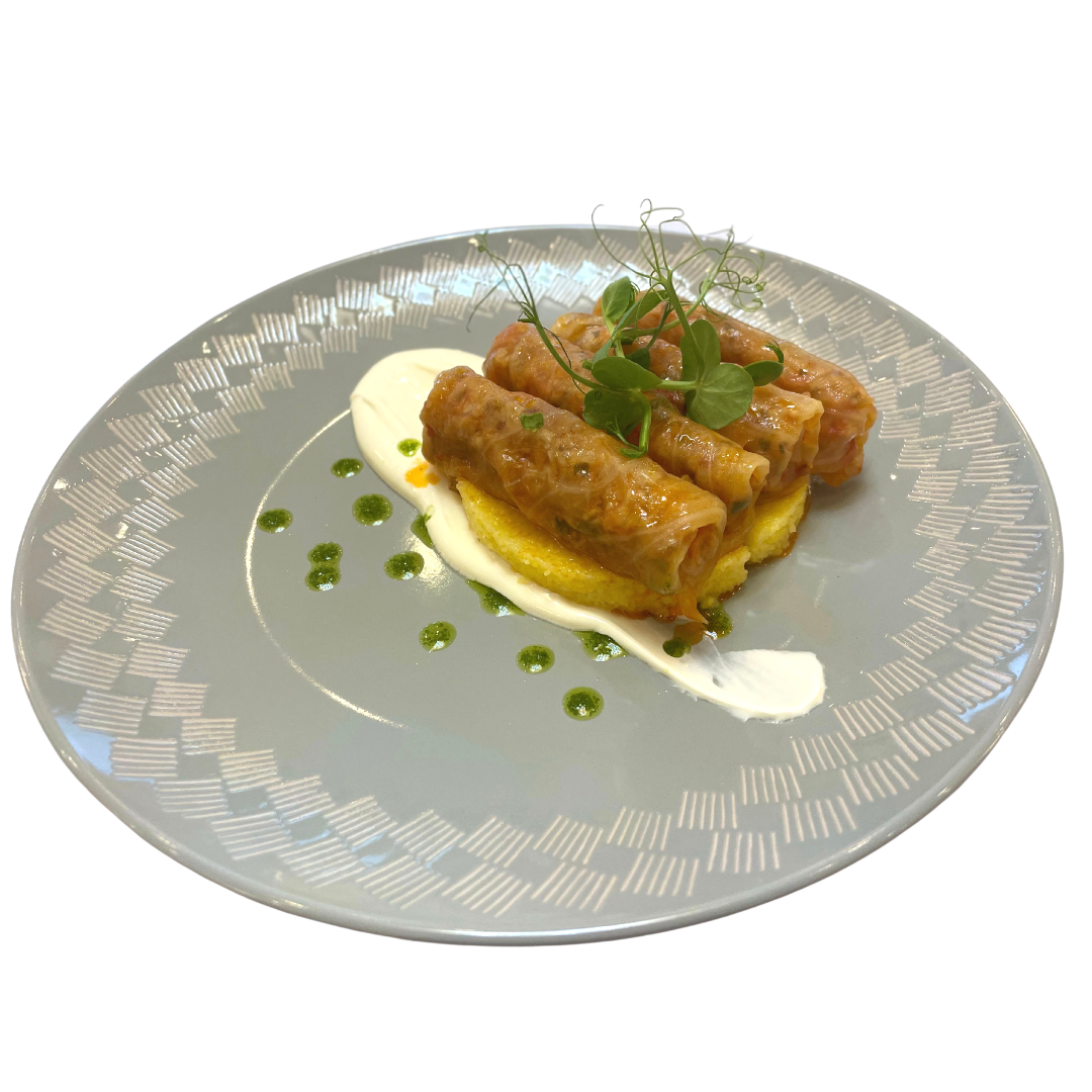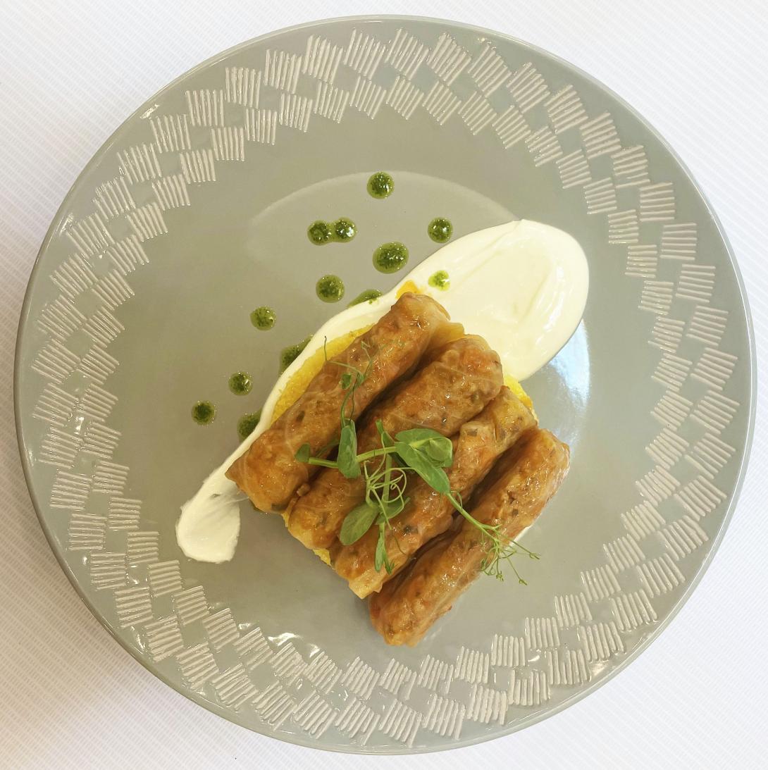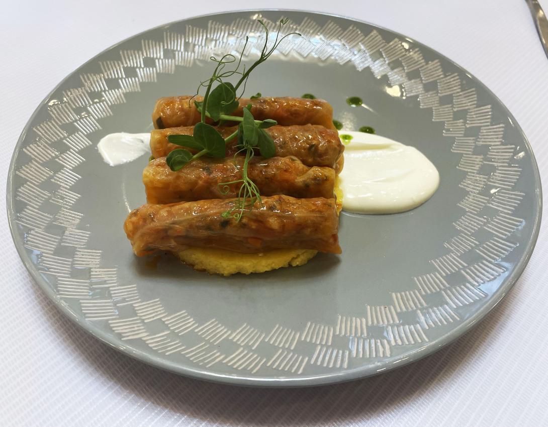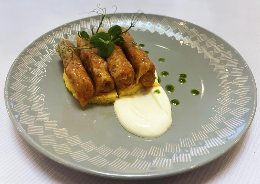 Cabbage leaves, stuffed with pork & rice, tomato sauce