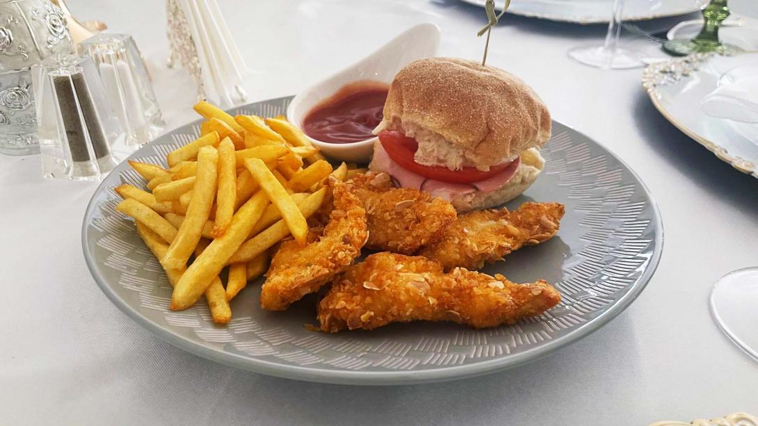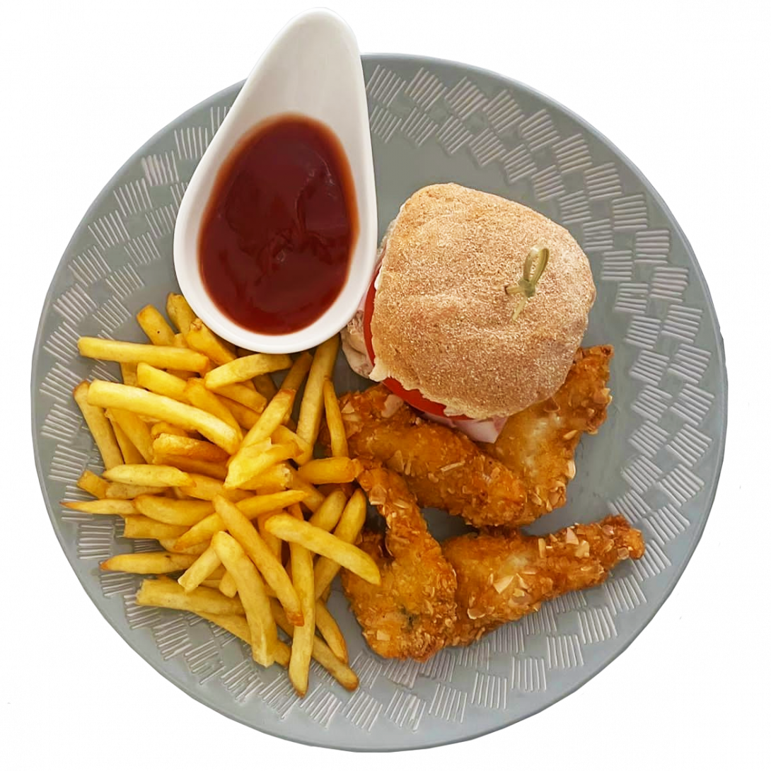 Chicken nuggets,fries,mozzarella burger,one scoup ice cream plus any juice or soft drink.